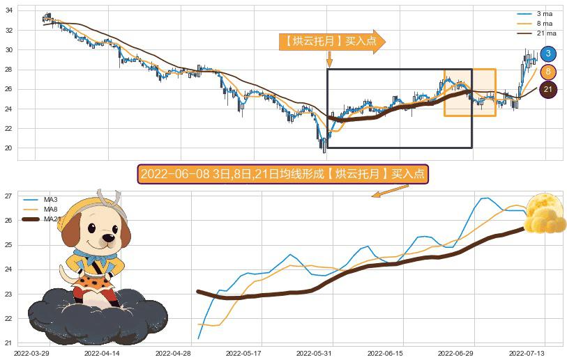 ⚀ 2022-04-29日-2022-07-12日显现 3日-8日-21日均线 【烘云托月】买入点 看多信号,后市看涨,买入