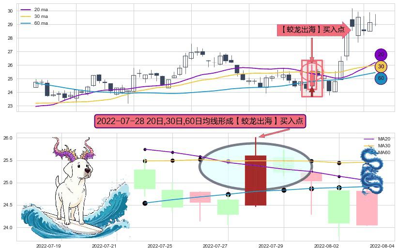 ⚀ 2022-07-28日显现 20日-30日-60日均线 【蛟龙出海】买入点 看多信号,后市看涨,买入