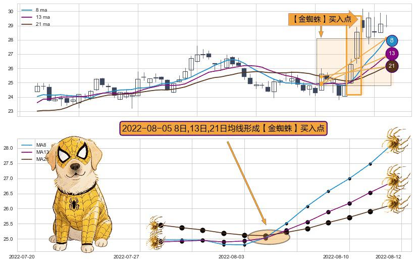⚀ 2022-08-05日显现 8日-13日-21日均线 【金蜘蛛】买入点 看多信号,后市看涨,买入