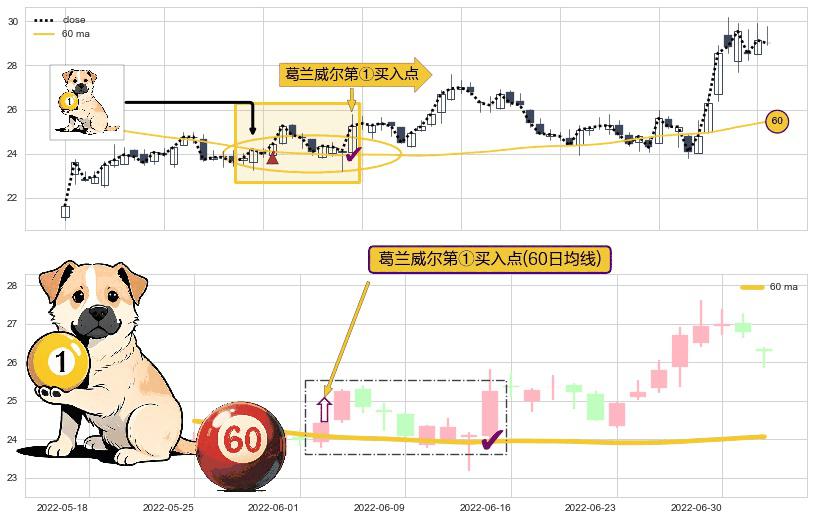⚀ 2022-06-02-日显现 葛兰威尔均线 60日均线 第买①入点 走势反转见底信号,后市看涨,买进信号