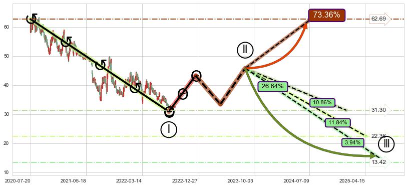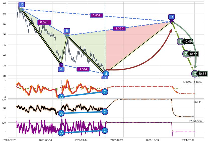 ➣ D点拟合预测价格56.14,距离最后交易收盘价格32.88相差 +70.73%