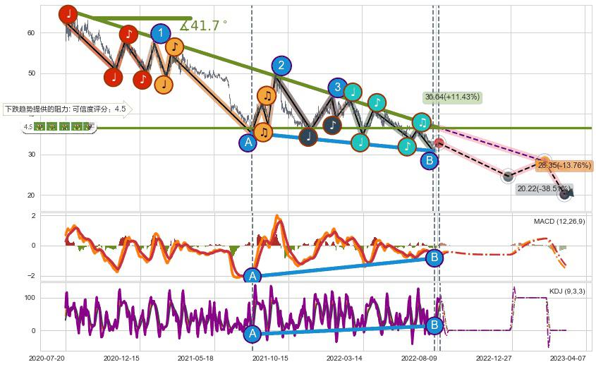 ♘ 在最后的下跌阶段2020-07-20至2022-08-12,存在 持续未破位的阻力位 ,阻力价格36.64,可信任强度88.80%,其距离最后价格32.88相差 +11.43%