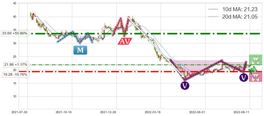 ♘ 阻力价格位21.86,可信任强度45.46%,距离最后交易2022-08-12形成的收盘价格21.61相差 +1.17%