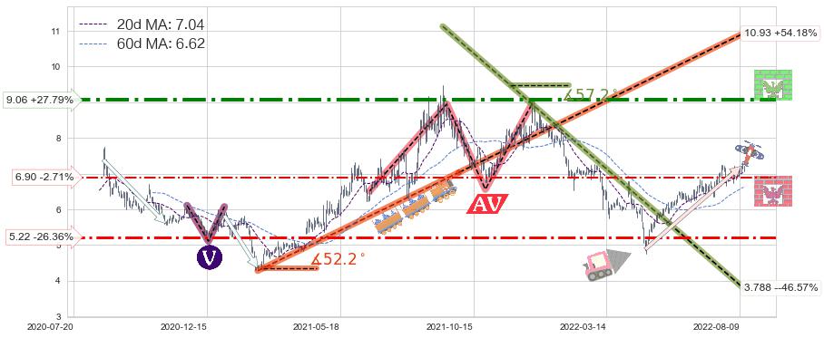 ♘ 阻力价格位9.06,可信任强度73.87%,距离最后交易2022-08-12形成的收盘价格7.09相差 +27.79%