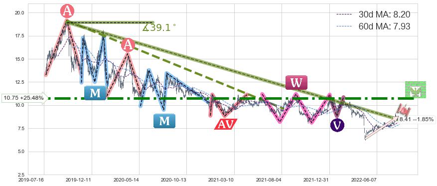 🦴 长线均值回复组合短线趋势跟踪[强阻力信号]2019-09-23-2022-08-09下跌趋势依然成立(下跌趋势跟踪依然存在),短线价格略微上行反弹(均值回复猜想),即将接近下跌趋势提供的未破位阻力价格:8.41。