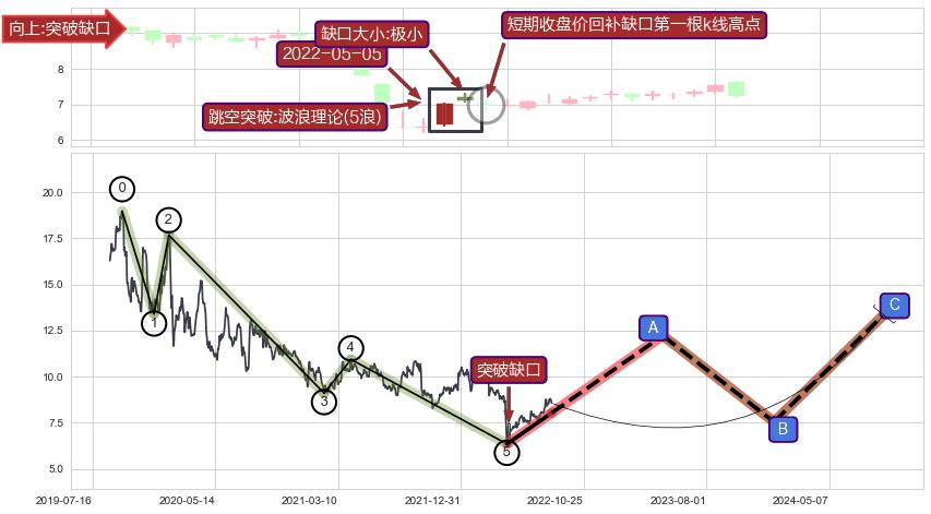 ➣ 突破缺口形成后,后续k已经超过14根,跳空突破波浪理论(5浪)关键点后, 出现【完全回踩】迹象, 但后续走势回踩幅度持续降低,缺口压制继续,短期收盘价回补缺口第一根k线高点