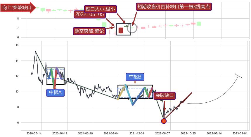 ➣ 突破缺口形成后,后续k已经超过14根,跳空突破缠论买卖点关键点后, 出现【完全回踩】迹象, 但后续走势回踩幅度持续降低,缺口压制继续,短期收盘价回补缺口第一根k线高点