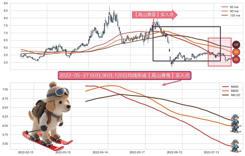 形态多维评估: ⚀ 2022-03-25日-2022-07-22日显现 60日-90日-120日均线 【高山滑雪】买入点 看多信号,后市看涨,买入