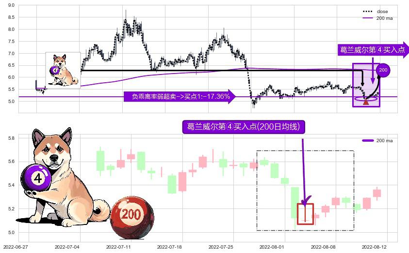 形态多维评估: ⚀ 2022-08-03-日显现 葛兰威尔均线 200日均线 第④买入点 下降趋势均值回复的短线反弹信号,后市看涨,买进信号