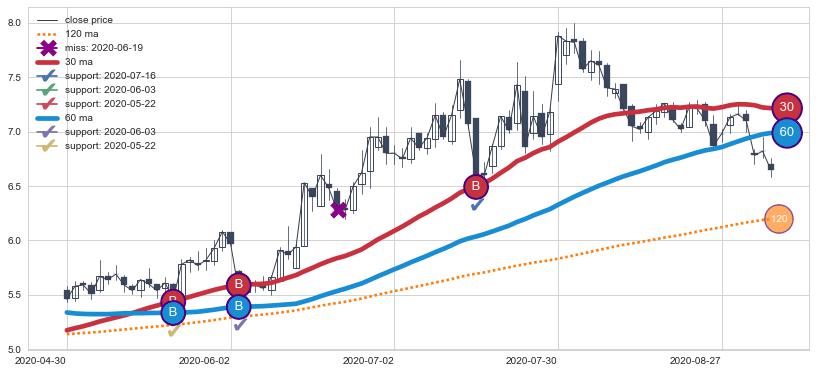 上涨趋势2020-04-30-2020-09-04,均线60, 30确认关键支撑3处