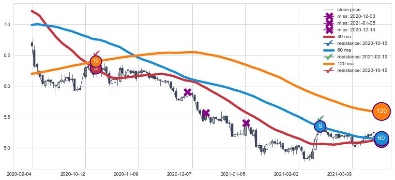 下跌趋势2020-09-04-2021-03-19,均线120, 60, 30确认关键阻力2处