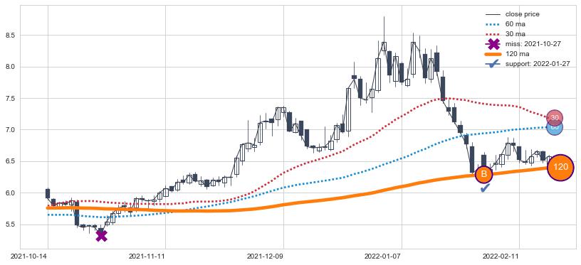 上涨趋势2021-10-14-2022-02-18,均线120确认关键支撑1处