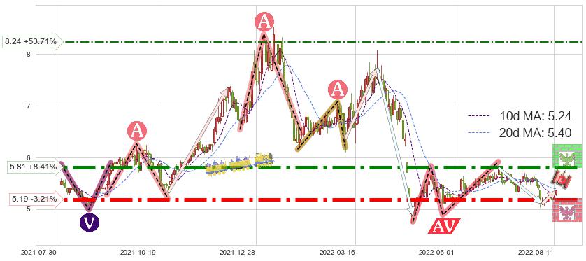 ♘ 阻力价格位5.81,可信任强度90.70%,距离最后交易2022-08-12形成的收盘价格5.36相差 +8.41%
