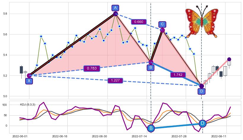 ➣ 已完成【蝴蝶】形态起点X: 2022-06-01, 终点D: 2022-08-03, 共45交易日