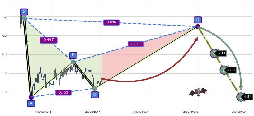 ➣ 未完成【蝙蝠】形态起点X: 2022-04-19, 已到达C点: 2022-08-03, 预测最终D点: 2022-12-28, 共178交易日