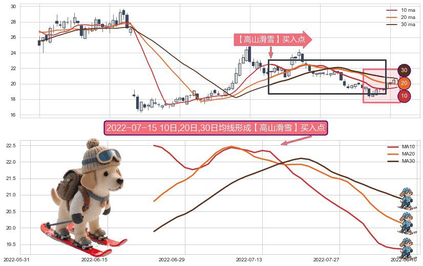 ⚀ 2022-06-23日-2022-08-08日显现 10日-20日-30日均线 【高山滑雪】买入点 看多信号,后市看涨,买入