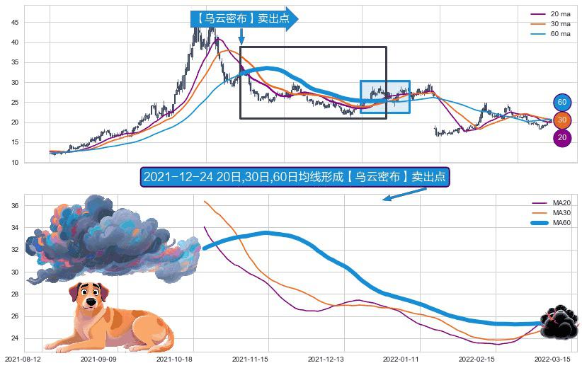 ⚀ 2021-10-21日-2022-03-08日显现 20日-30日-60日均线 【乌云密布】卖出点 看空信号,后市看跌,卖出