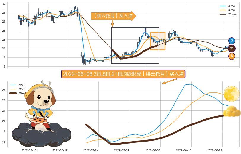 ⚀ 2022-05-20日-2022-06-23日显现 3日-8日-21日均线 【烘云托月】买入点 看多信号,后市看涨,买入