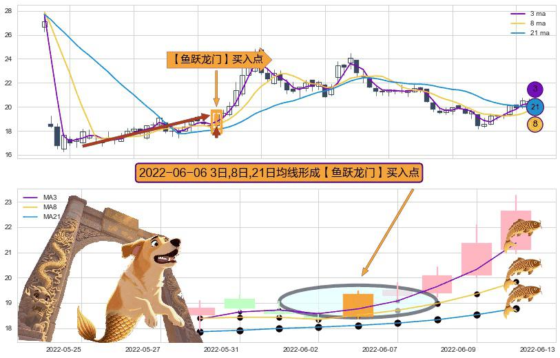 ⚀ 2022-06-06日显现 3日-8日-21日均线 【鱼跃龙门】买入点 看多信号,后市看涨,买入