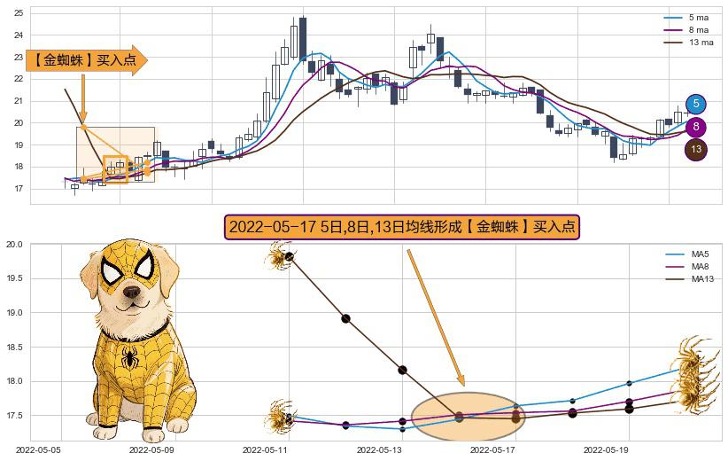 ⚀ 2022-05-17日显现 5日-8日-13日均线 【金蜘蛛】买入点 看多信号,后市看涨,买入