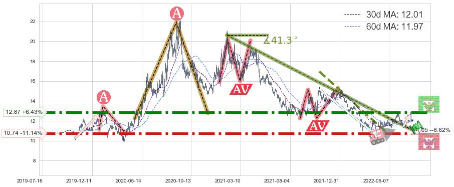 ♘ 支撑价格位10.74,可信任强度92.42%,距离最后交易2022-08-12形成的收盘价格12.09相差 -11.14%