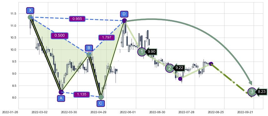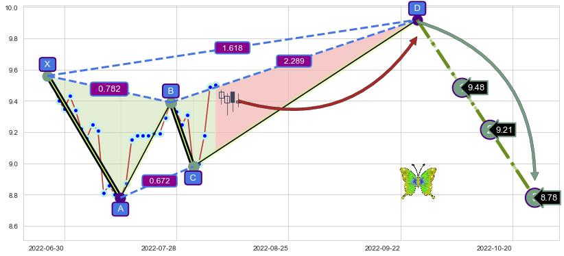 ➣ 未完成【蝴蝶】形态起点X: 2022-06-27, 已到达C点: 2022-08-02, 预测最终D点: 2022-09-27, 共63交易日