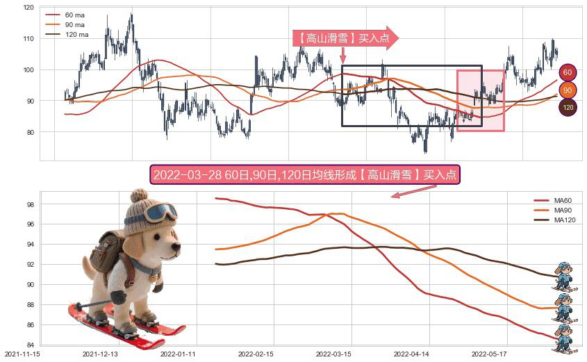 形态多维评估: ⚀ 2022-01-18日-2022-06-06日显现 60日-90日-120日均线 【高山滑雪】买入点 看多信号,后市看涨,买入