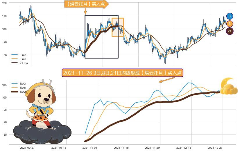形态多维评估: ⚀ 2021-10-26日-2021-12-28日显现 3日-8日-21日均线 【烘云托月】买入点 看多信号,后市看涨,买入