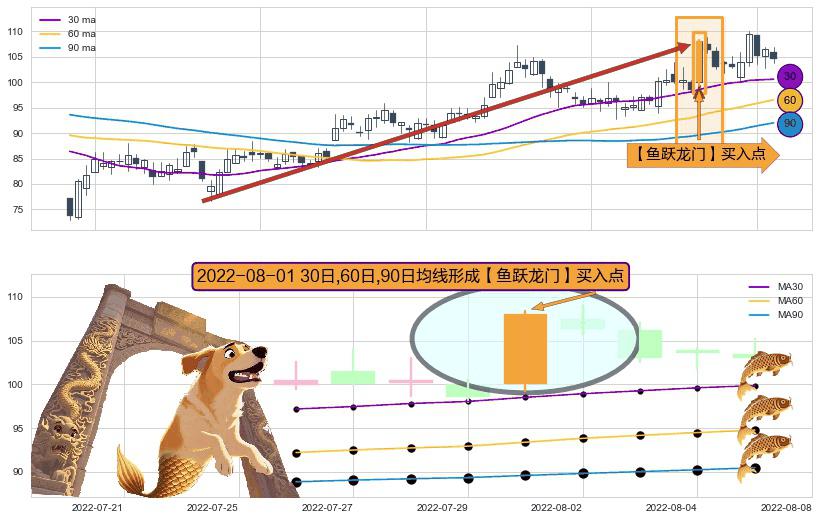 形态多维评估: ⚀ 2022-08-01日显现 30日-60日-90日均线 【鱼跃龙门】买入点 看多信号,后市看涨,买入