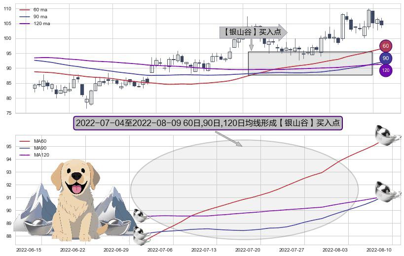 形态多维评估: ⚀ 2022-07-05-日至2022-08-09-日显现 60日-90日-120日均线 【银山谷】买入点 看多信号,后市看涨,买入