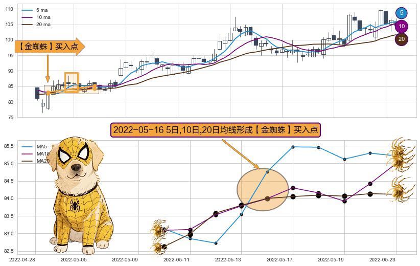 形态多维评估: ⚀ 2022-05-16日显现 5日-10日-20日均线 【金蜘蛛】买入点 看多信号,后市看涨,买入