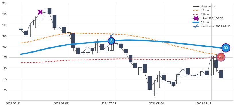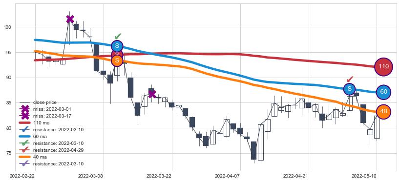 下跌趋势2022-02-22-2022-05-10,均线40, 60, 110确认关键阻力2处