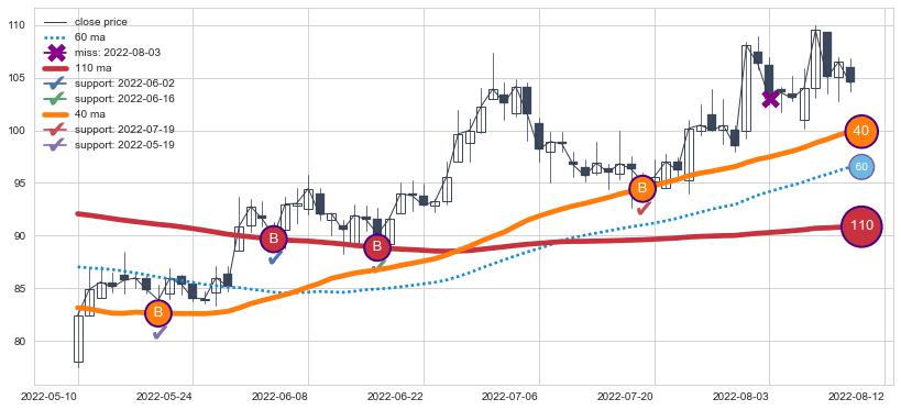 上涨趋势2022-05-10-2022-08-12,均线40, 110确认关键支撑4处