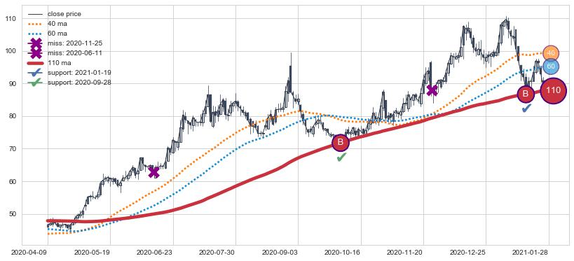 上涨趋势2020-04-09-2021-01-28,均线110确认关键支撑2处
