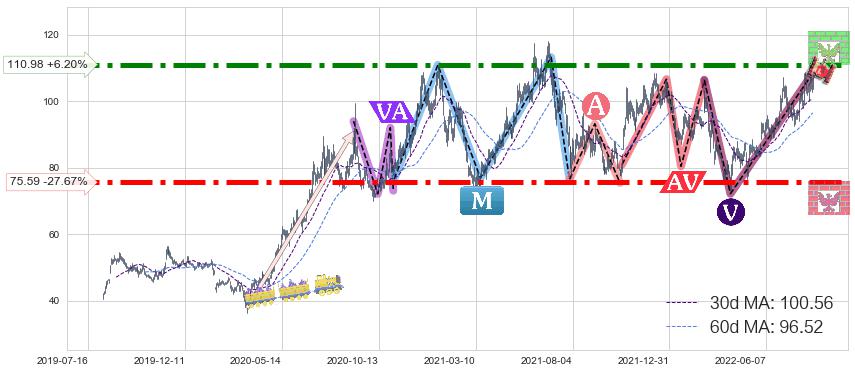 ♘ 阻力价格位110.98,可信任强度96.02%,距离最后交易2022-08-12形成的收盘价格104.50相差 +6.20%