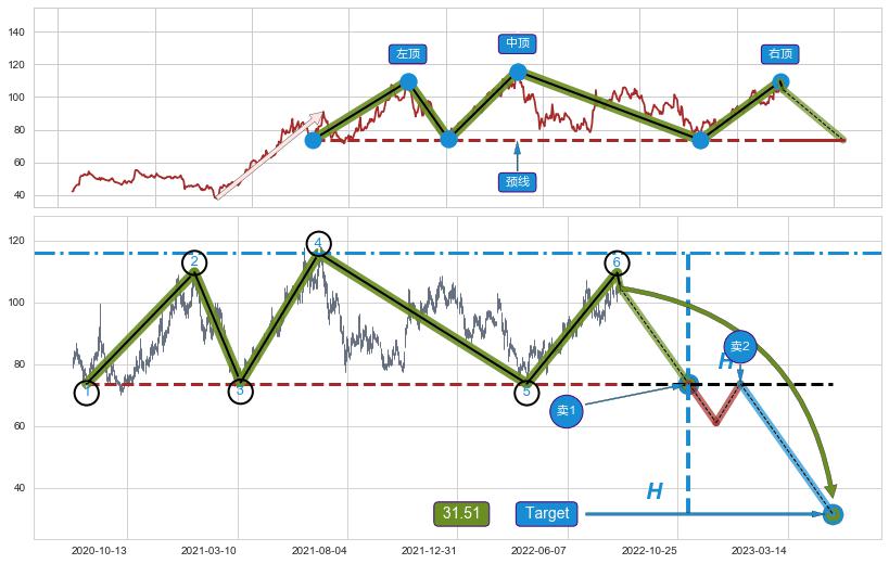 ➢ 最小反转跌幅→𝐇: 42.15 (三重顶波峰高点到两个波谷连线的垂直距离)