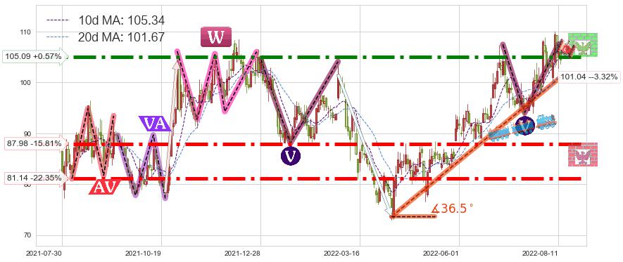 ♘ 阻力价格位105.09,可信任强度94.39%,距离最后交易2022-08-12形成的收盘价格104.50相差 +0.57%