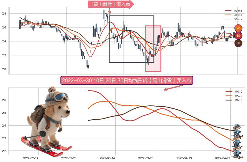 ⚀ 2022-03-03日-2022-04-28日显现 10日-20日-30日均线 【高山滑雪】买入点 看多信号,后市看涨,买入