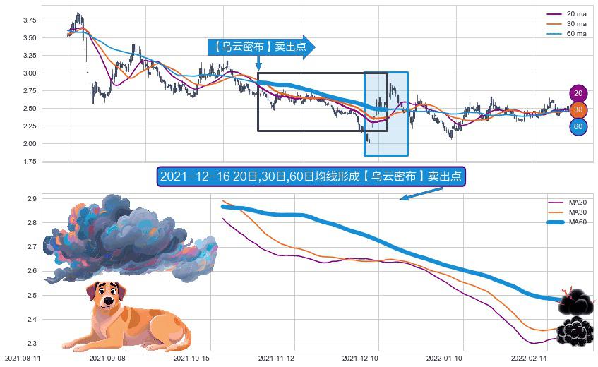 ⚀ 2021-10-20日-2022-02-21日显现 20日-30日-60日均线 【乌云密布】卖出点 看空信号,后市看跌,卖出