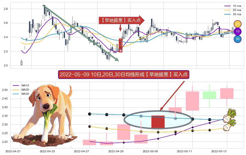 ⚀ 2022-05-09日显现 10日-20日-30日均线 【旱地拔葱】买入点 看多信号,后市看涨,买入