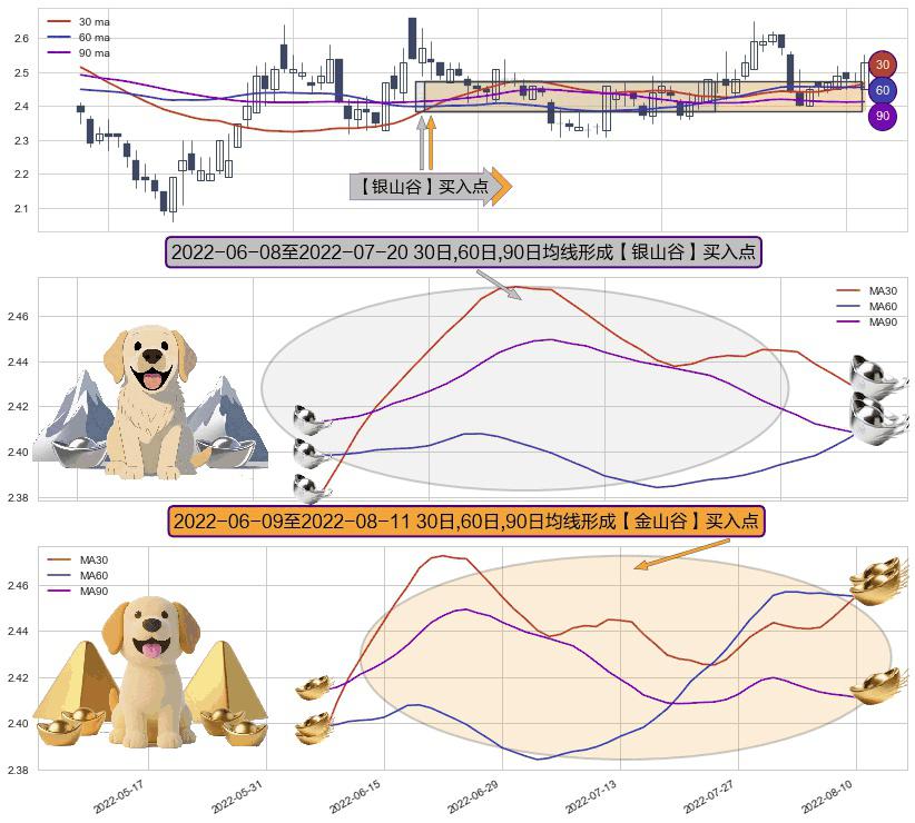 ⚀ 2022-06-10-日至2022-08-11-日显现 30日-60日-90日均线 【金山谷】买入点 其再次确认了买入信号,可靠性更强,买入