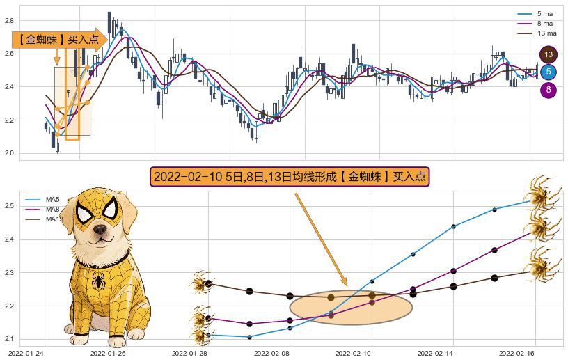 ⚀ 2022-02-10日显现 5日-8日-13日均线 【金蜘蛛】买入点 看多信号,后市看涨,买入