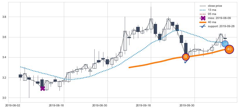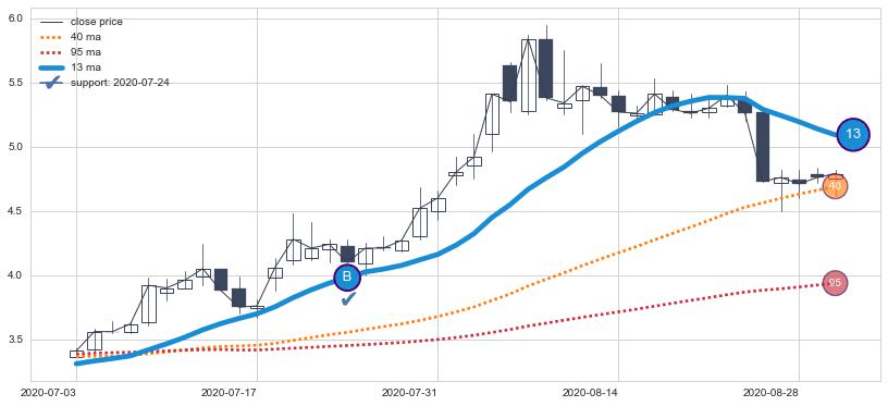 ⚀ 中期均线MA8上穿长期均线MA13形成的交叉是标准 黄金交叉
