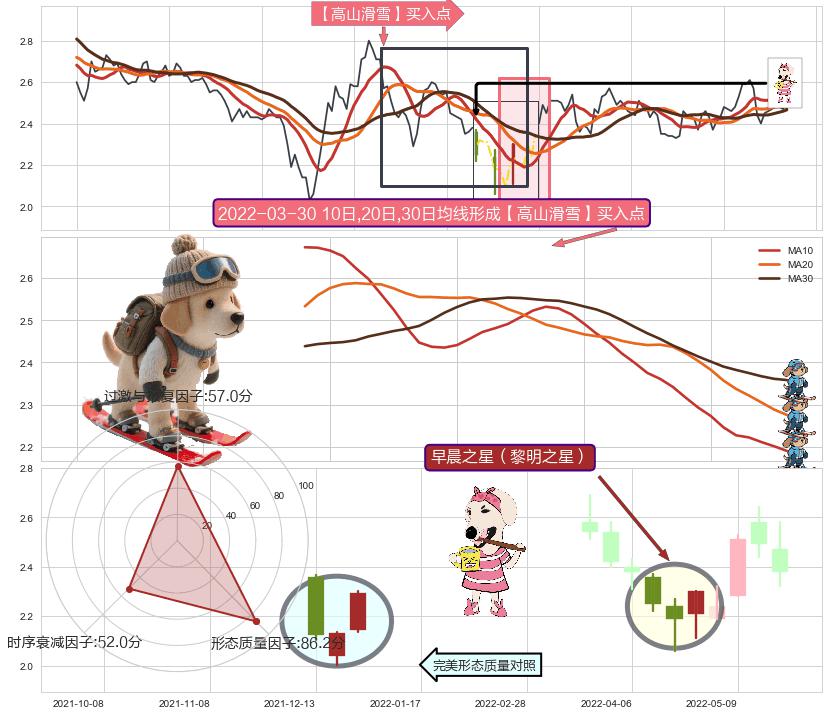 | 2 🅚:早晨之星(黎明之星) ➕ 🎢:【旱地拔葱】买入点均线组合买入点信号形成后,猜想后续向上脱离整理形态,持续突破上升 ☞ 看多信号 ⇥ 【均线】交织【🅚线】⇥ 综合量化分数: 53 | > |