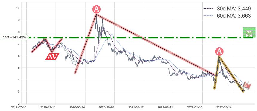 ♘ 阻力价格位7.53,可信任强度87.52%,距离最后交易2022-08-12形成的收盘价格3.120相差 +141.42%