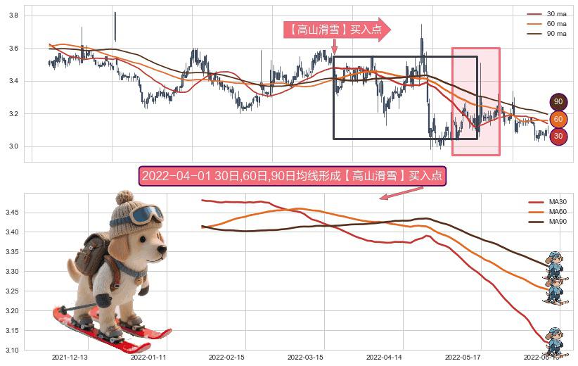 形态多维评估: ⚀ 2022-01-24日-2022-06-10日显现 30日-60日-90日均线 【高山滑雪】买入点 看多信号,后市看涨,买入