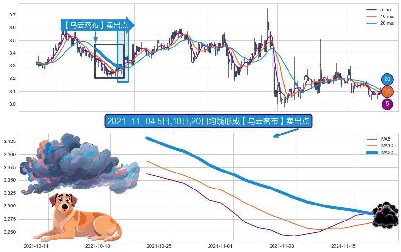 形态多维评估: ⚀ 2021-10-21日-2021-11-17日显现 5日-10日-20日均线 【乌云密布】卖出点 看空信号,后市看跌,卖出