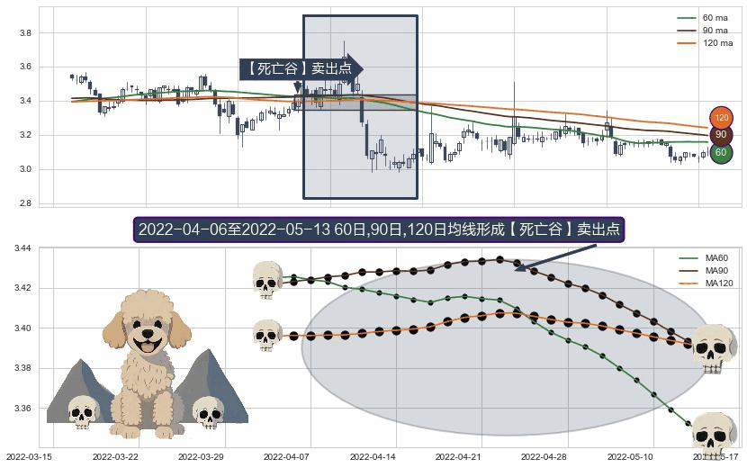 形态多维评估: ⚀ 2022-04-07-日至2022-05-13-日显现 60日-90日-120日均线 【死亡谷】卖出点 看空信号,后市看跌,卖出