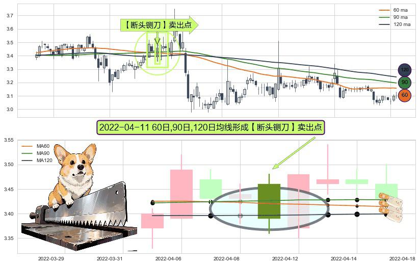 形态多维评估: ⚀ 2022-04-11日显现 60日-90日-120日均线 【断头铡刀】卖出点 看空信号,后市看跌,卖出