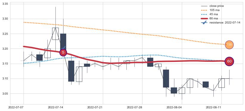 下跌趋势2022-07-07-2022-08-12,均线60确认关键阻力1处